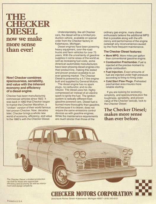 tra il 1980 e il 1982 venne introdotto nella gamma un motore Diesel V8 di origine General Motors, progettato dalla divisione Oldsmobile, che fu proposto a seguito della crisi petrolifera, la quale portò ad una contrazione di vendite del modello Marathon. Tuttavia il calo degli ordini avvenne anche a causa dell’agguerrita concorrenza nel settore dei Taxi, che presentava un’ampia scelta di modelli più moderni, prodotti dalle Big Three, contro i quali l’anziano progetto Marathon non poteva competere;