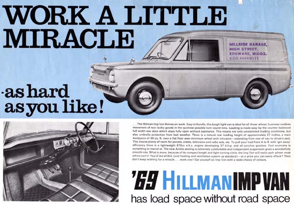 Per le sue caratteristiche meccaniche la Imp venne inoltre impiegata nei rally, dove ottenne, nel 1965, la vittoria del Rally dei Tulipani. La piccola Hillman non fu mai, come già detto un successo, perché la sua produzione venne affidata ad un personale inesperto, che contribui a dare l’immagine di scarsa affidabilità alla vettura, in aggiunta non furono d’aiuto le proteste sindacali che si susseguirono all’interno dello stabilimento scozzese. In aggiunta, la Imp, fu prodotta anche con costi elevati, dovuti alla dislocazione della produzione.