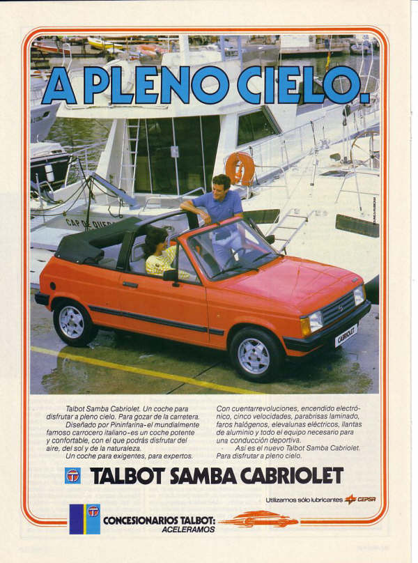 Tra profondi restyling e nuovi modelli, arrivò nel 1982, anche il turno della compatta Samba, di cui parleremo nell’articolo, che venne presentata come sostituta della vetusta Talbot Sunbeam, vincitrice in versione sportiva Lotus, del titolo mondiale marche rally con i piloti Henri Toivonen e Guy Frequelin, l’anno precedente. La Samba riprendeva, a livello stilistico, le linee squadrate e semplici degli altri modelli, insieme a finiture essenziali ed una impostazione meccanica con motore anteriore trasversale e trazione anteriore.