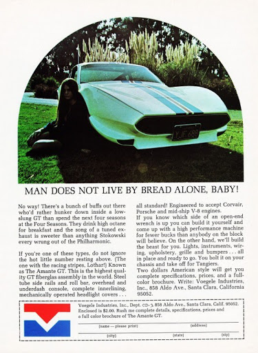 Bill Voegele, iniziò la sua attività lavorativa in Fiberfab, nota azienda di auto in kit con carrozzeria in vetroresina, alla fine degli anni sessanta, periodo nel quale questo genere di aziende era sulla cresta dell’onda. L’ingegnere meccanico, si rese conto ben presto che la qualità delle vetture non era sempre buona, e si scontrò spesso con i vertici Fiberfab, senza ottenere grande considerazione. Maturò quindi l’idea di mettersi in proprio, assieme ad altri due, già ex, colleghi che nel frattempo avevano avviato una loro attività di costruzione di vetture in vetroresina, sempre a Santa Clara in California. John Hebler e John Ubina avevano fondato la Hebina Plastics, ma la loro attività era a corto di denaro, e avevano diversi problemi a lanciarsi sul mercato con il loro nuovo prodotto: la Gazelle.