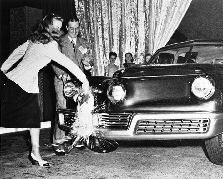 La presentazione ufficiale avvenne nello stabilimento Tucker, a Chicago, nel Giugno 1947 e, nonostante il sopraggiungere di alcune problematiche meccaniche impreviste proprio poco prima della presentazione, la nuova auto colpì subito per il suo design moderno, caratterizzato da una linea tondeggiante, da qui il soprannome di Tin Goose (oca di latta), che servì anche ad ottenere un Cx di soli 0,27, risultato sorprendente per l’epoca. Anche l’altezza contenuta della vettura, di appena 1520 mm, permise di arrivare a questo straordinario risultato e fu per questo motivo che le portiere vennero estese anche su una parte del tetto, facilitando così l’accesso all’abitacolo. Sempre esternamente altra caratteristica innovativa che arricchiva il comparto sicurezza della 48, era il faro centrale che seguiva le ruote anteriori e, che garantiva una maggiore visibilità in curva. Seguiva poi una scocca altamente resistente con roll bar integrato nel tetto, in grado di offrire sufficiente protezione agli occupanti in caso di incidente. Anche all’interno erano molto curati il confort e la sicurezza con plancia e portiere imbottite e piantone dello sterzo collassabile; saltava inoltre all’occhio, l’originale disposizione dei comandi dietro al volante, tutti ben visibili e a portata di mano. Altra innovazione era il vetro del parabrezza infrangibile, che si staccava dalla vettura in caso di incidente e non andando in pezzi, evitava il prodursi di schegge durante l’impatto.