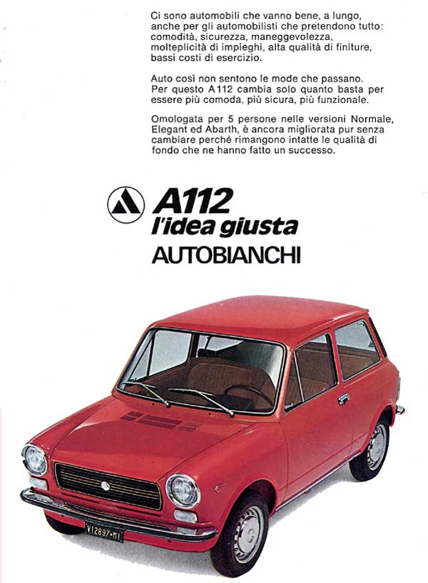 Il costante successo dell’A112 spinse l’Autobianchi ad introdurre, nel corso dei suoi 17 anni di produzione, costanti aggiornamenti sul modello, andando con ordine nel 1973, vide la luce la seconda serie, che differiva dalla precedente per i paraurti rivestiti in gomma, per l’ingresso in gamma della nuova versione Elegant, che prendeva il posto della precedente E, oltre alla possibilità di ordinare in tinta unica la versione Abarth. Modifiche più marcate vennero introdotte, nel 1975, con la terza serie, la quale adottava fari posteriori ridisegnati ed il quinto posto di serie, ottenuto grazie a modifiche dei pannelli posteriori, volte ad aumentare l’abitabilità per il terzo posto. Dal punto di vista meccanico da segnalare l’adozione del 1.049 CC da 70 CV che andò ad equipaggiare la versione Abarth denominata 70 HP,  che spingeva la vettura fino ad una velocità massima 160 Km/h, posizionandosi ai vertici della categoria, se non oltre, in quanto proponeva prestazioni da auto di cilindrata e dimensioni superiori. Nel 1977 venne introdotta la quarta serie, caratterizzata da un nuovo frontale ridisegnato, con mascherina trapezoidale e dal diverso disegno del tetto, rialzato di 2 cm per migliorare l’abitabilità, vennero rinnovati anche i fari posteriori e gli interni. Dal punto di vista meccanico si vide l’introduzione del nuovo propulsore 963 CC da 48 Cv. Questa versione rimase in listino fino al 1979, quando venne sostituita dalla quinta serie, che adottava nuovi paraurti e passaruota in plastica su tutte le versioni, nuove fasce laterali e fari posteriori ridisegnati, modifiche che caricarono forse eccessivamente l’elegante linea della vettura, ma che comunque non alterano le vendite. Con l’occasione venne introdotta alla base della gamma la giovanile versione Junior (903 CC), equipaggiata con tettuccio apribile in tela di serie. Per ciò che concerne a meccanica, si segnala l’introduzione del nuovo cambio a 5 marce.