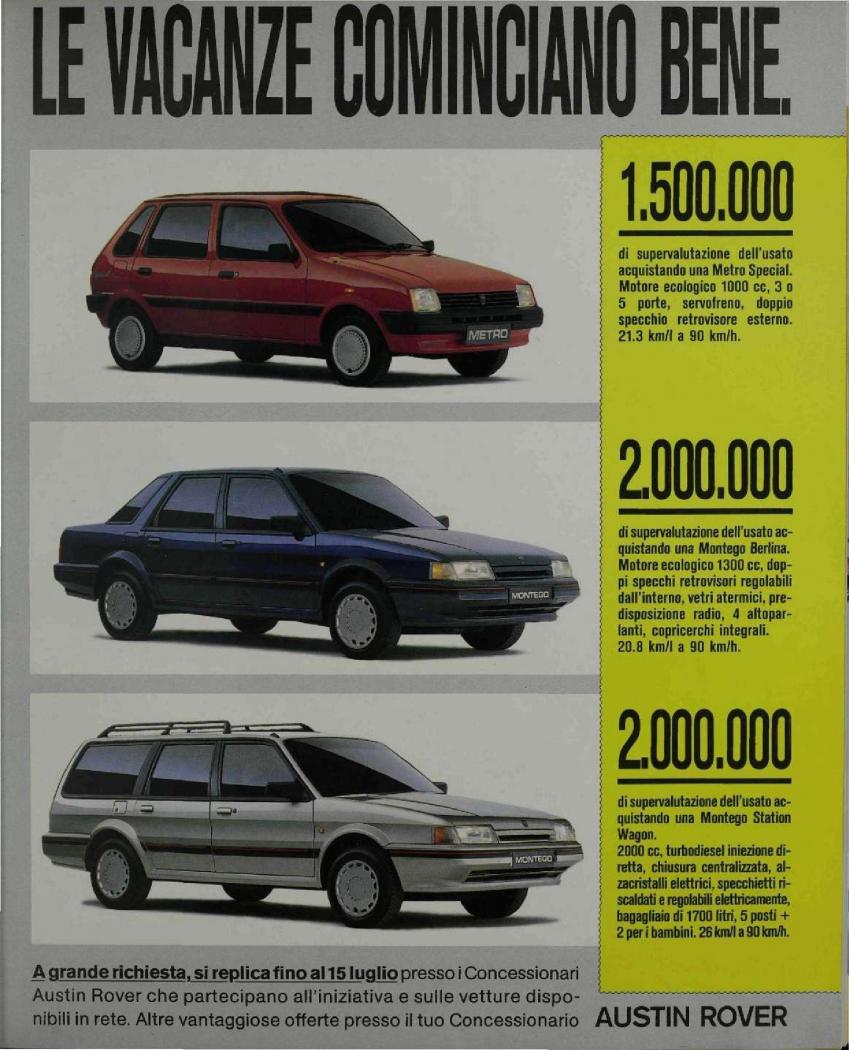 Nel 1988 a seguito di un leggero restyling che interessò la mascherina frontale e altri dettagli, la Montego, assieme alla restante gamma che comprendeva la Metro e la Maestro, venne inserita come entry level sotto il marchio Rover, a seguito della soppressione del marchio Austin, avvenuta l’anno prima. Non venne effettuata alcuna operazione di rebadging e, le vetture, furono semplicemente identificate con il nome del modello in sostituzione del marchio. Cambiò nuovamente nome anche il gruppo, ora ribattezzato Rover Group, che tornò, dopo la nazionalizzazione avvenuta anni prima per scongiurarne il fallimento, ad essere nuovamente privatizzato, dopo l’acquisto di quest’ultimo da parte della British Aerospace. Contestualmente al canto del cigno del marchio Austin, arrivò in gamma uno dei primi motori diesel ad iniezione diretta dell’epoca, sviluppato in collaborazione con la Perkins, il quattro cilindri due litri offriva 81 CV e discrete prestazioni. La produzione della Montego andò avanti fino al 1994 quando, dopo più di mezzo milione di unità vendute in 10 anni, calò il sipario sull’ultimo modello del marchio, fondato da Herbert Austin, nel 1905.
