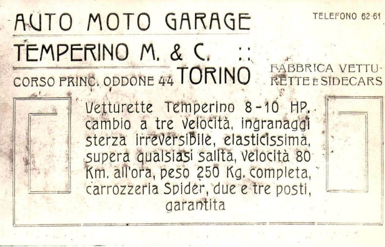 Soffermandoci a pensare a cosa rappresenta il mondo dell’industria automobilistica oggi, viene spontaneo concentrarci sulla parola profitto, cardine essenziale del fare industria moderno. Ovviamente il profitto è sempre stato il perno centrale dell’impresa, ma in passato non era l’unico elemento preponderante. Pensiamo, per esempio, alle auto di inizio ‘900, molto spartane, se paragonate a quelle nate anche solo qualche decennio dopo, la cui semplicità e la passione con cui venivano realizzate, era la loro caratteristica più marcata, così come la loro durabilità. Sicuramente la novità della “carrozza a motore” aveva riempito di entusiasmo e voglia di fare, i pionieri di quel periodo, ma oggi che il mondo dell’auto sta affrontando una nuova rivoluzione, ovvero il passaggio dal motore termico a quello elettrico, tutto queste peculiarità sono scomparse, lasciando spazio al mero guadagno e al marketing. Vale la pena, quindi, di ripercorre la storia di quei costruttori, molti dei quali scomparsi in breve tempo, che hanno però lasciato qualcosa di indelebile, capace di andare oltre la loro storia. I fratelli Temperino fanno parte di quel mondo, di quel coraggio e voglia di innovare, che caratterizzò il ‘900, nonostante la morte e la distruzione di due guerre mondiali.