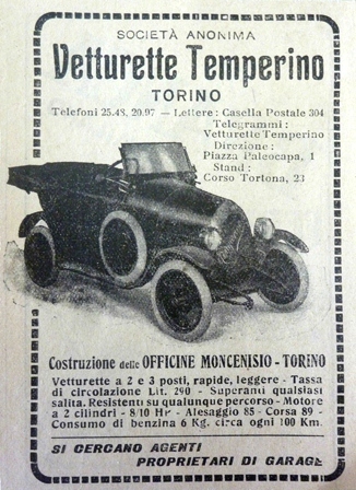 Successivamente, nel 1908, i Temperino realizzarono il prototipo di una vetturetta compatta spinta da un motore motociclistico raffreddato ad aria, inizialmente da 350 CC e, in seguito, adottando un più potente 800 CC. Dovettero, però, passare vari anni prima che il progetto prendesse realmente forma. L’occasione arrivò dopo la fine della Grande Guerra, quando i tempi erano maturi per una vettura semplice e leggera come la loro 8/10 HP.