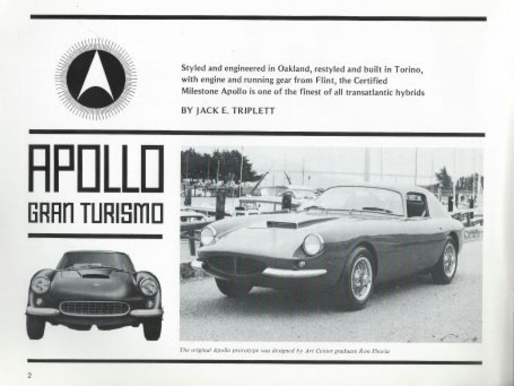 Il nome Apollo, nel corso della storia dell’automobile, è stato adottato in più occasioni, infatti, già nei primi anni 20 del ‘900 con questo nome era identificata una casa automobilistica tedesca che produceva una vettura di nome Piccolo, mentre oggi, il nome Apollo, identifica il nuovo corso della casa automobilistica Gumpert. Nel nostro caso questo nome ha identificato una vettura sportiva americana dei primi anni 60, la cui storia si è intrecciata anche con l’Italia. L’Apollo americana nacque grazie all’incontro, durante il Gran Premio di Monaco del 1960, tra Frank Reisner, ingegnere di origini ungheresi trapiantato in Canada, fondatore della Intermeccanica, che in quel periodo esercitava a Torino, in Italia, producendo kit di elaborazione per vettura esistenti e, l’ingegnere californiano Milt Brown, il cui sogno era di costruire una vettura sportiva, in grado di competere con marchi di rilievo, quali ad esempio Ferrari.