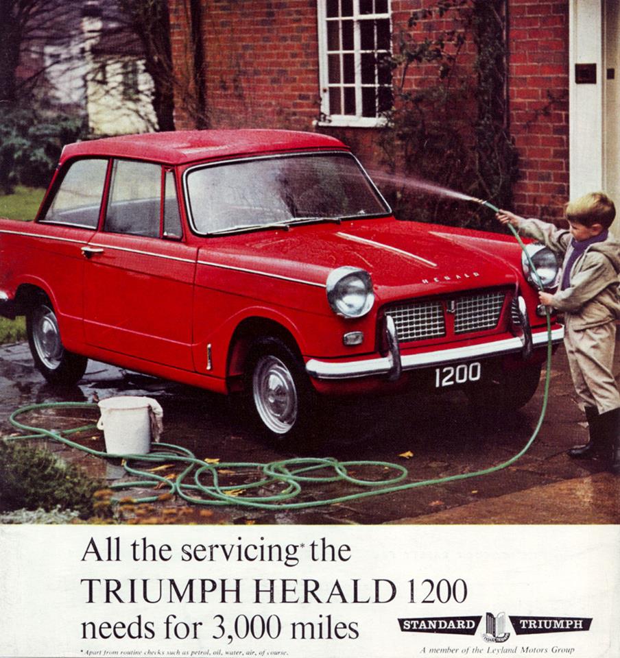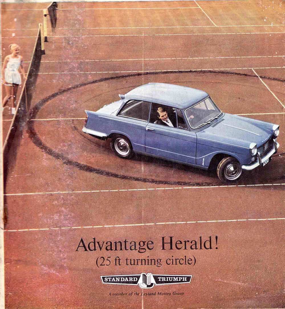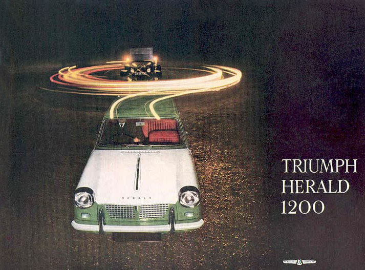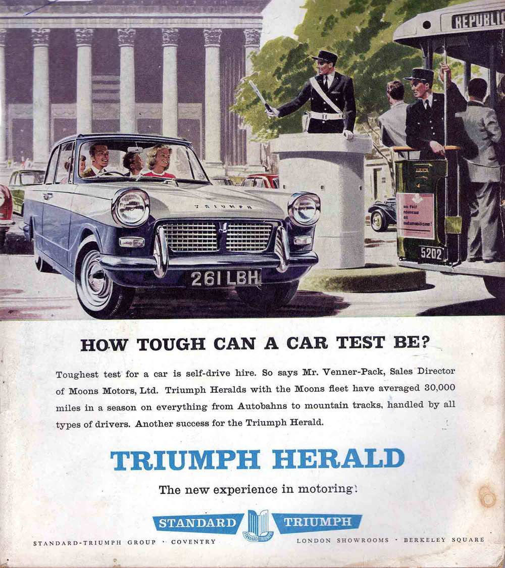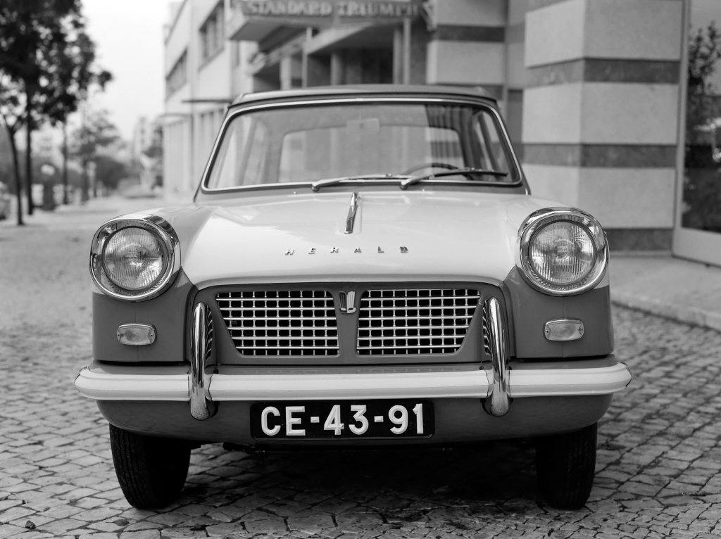 Al momento del suo lancio, nel 1959, la Herald suscitò interesse, tuttavia venne criticata per il motore 4 cilindri, derivato dalla Standard Eight, di 849 CC e 39 Cv, giudicato troppo poco potente. Questa inadeguatezza si fece sentire maggiormente soprattutto nelle versioni Coupé e Convertible, presentate l’anno seguente. Nel 1961 in concomitanza con l’ingresso dell’azienda nel gruppo Leyland, la Herald beneficiò di varie migliorie, a cominciare dal propulsore, ora di 1147 CC e 48 CV, che diede vita alla versione 1200. Novità anche per gli interni ora dotati di plancia in legno e altre migliorie di finizione. Venne introdotto anche l’optional dei freni a disco sulle ruote anteriori. Sempre in quell’anno entrò in produzione la Herald Estate, versione station wagon, dotata di portellone con ribaltina. Derivata da quest’ultima, la commerciale Courier, prodotta dal 1962 fino al 1964, anno in cui escì di scena anche la versione Coupé, giudicata concorrente della nuova Spitfire.