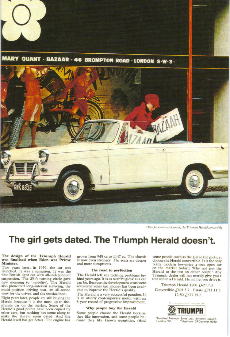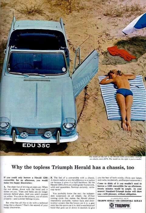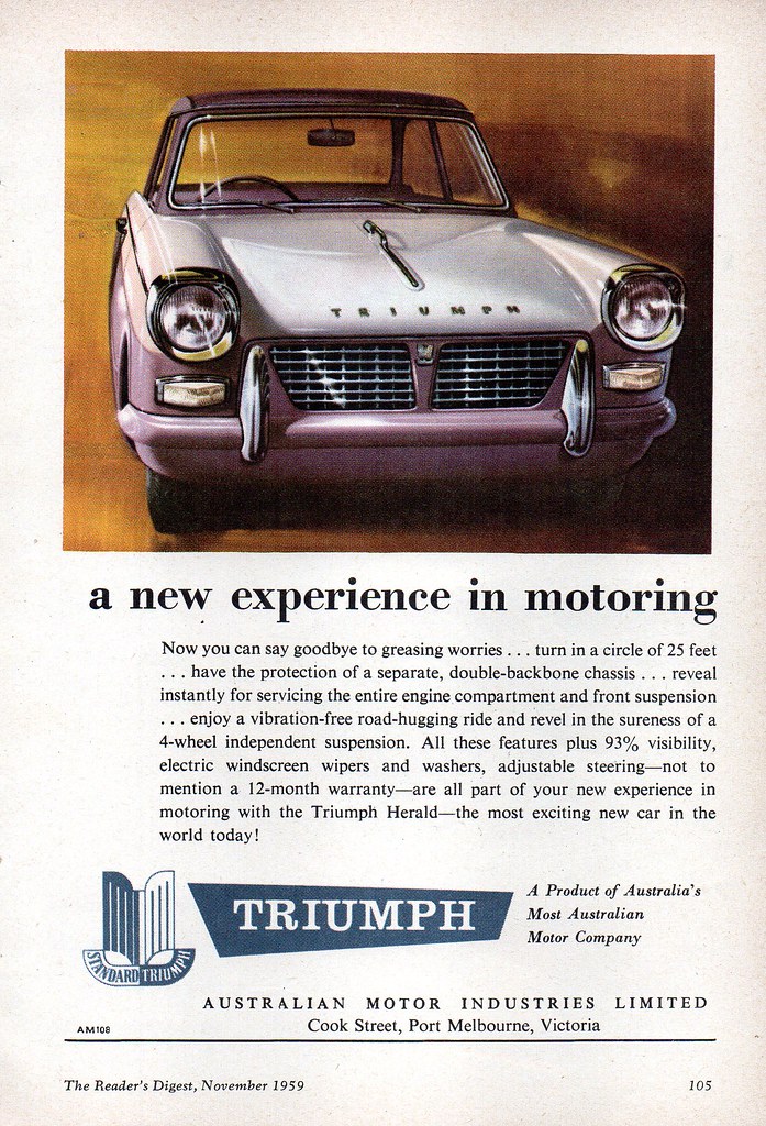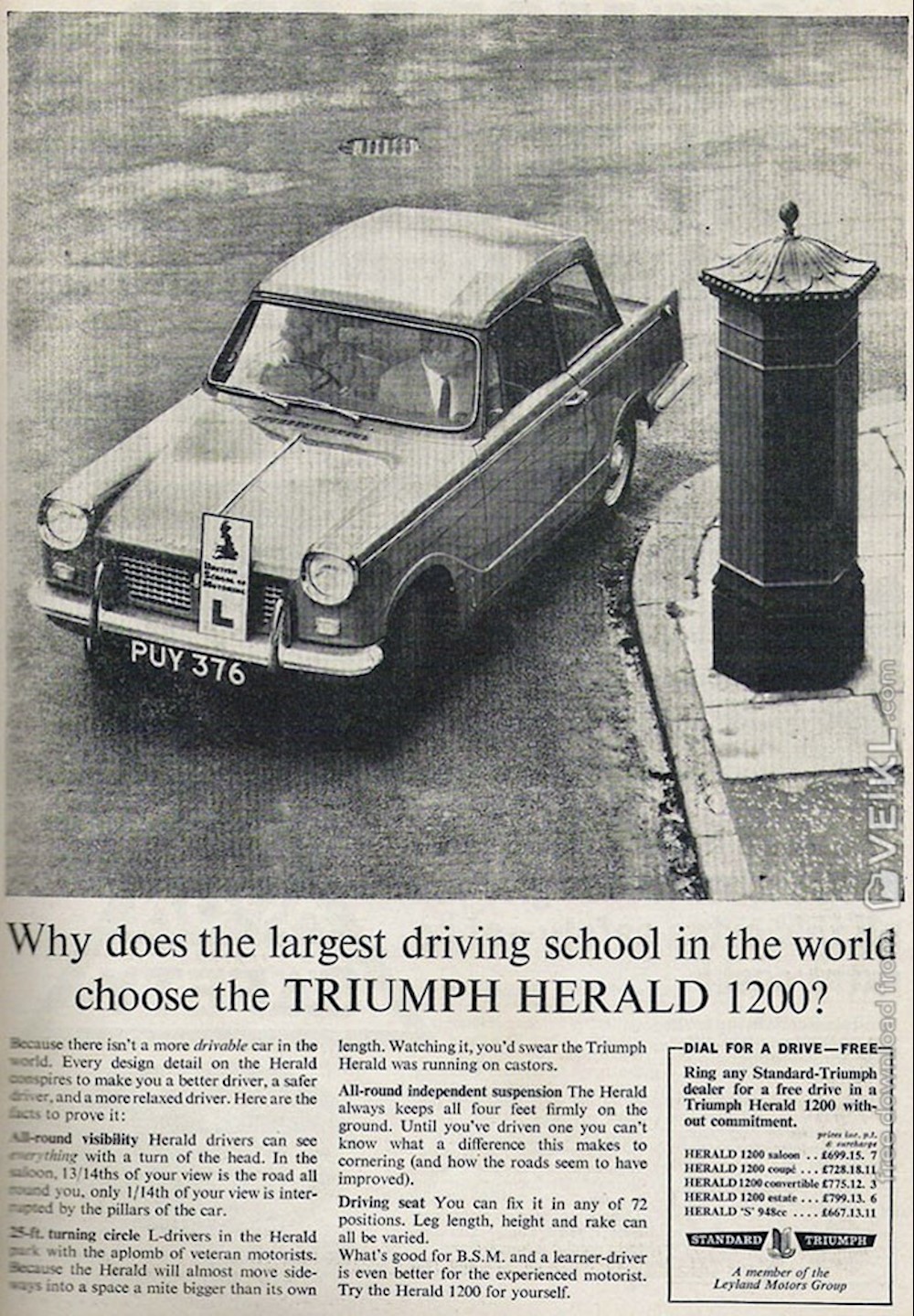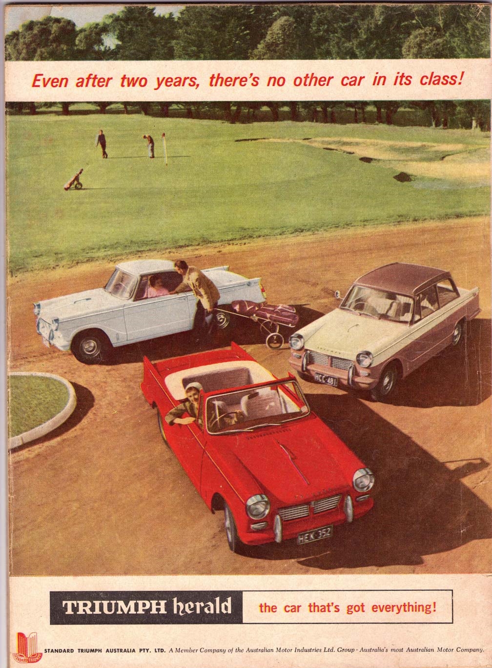 Al momento del suo lancio, nel 1959, la Herald suscitò interesse, tuttavia venne criticata per il motore 4 cilindri, derivato dalla Standard Eight, di 849 CC e 39 Cv, giudicato troppo poco potente. Questa inadeguatezza si fece sentire maggiormente soprattutto nelle versioni Coupé e Convertible, presentate l’anno seguente. Nel 1961 in concomitanza con l’ingresso dell’azienda nel gruppo Leyland, la Herald beneficiò di varie migliorie, a cominciare dal propulsore, ora di 1147 CC e 48 CV, che diede vita alla versione 1200. Novità anche per gli interni ora dotati di plancia in legno e altre migliorie di finizione. Venne introdotto anche l’optional dei freni a disco sulle ruote anteriori. Sempre in quell’anno entrò in produzione la Herald Estate, versione station wagon, dotata di portellone con ribaltina. Derivata da quest’ultima, la commerciale Courier, prodotta dal 1962 fino al 1964, anno in cui escì di scena anche la versione Coupé, giudicata concorrente della nuova Spitfire.