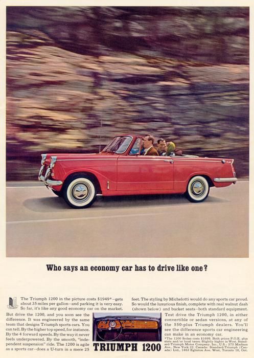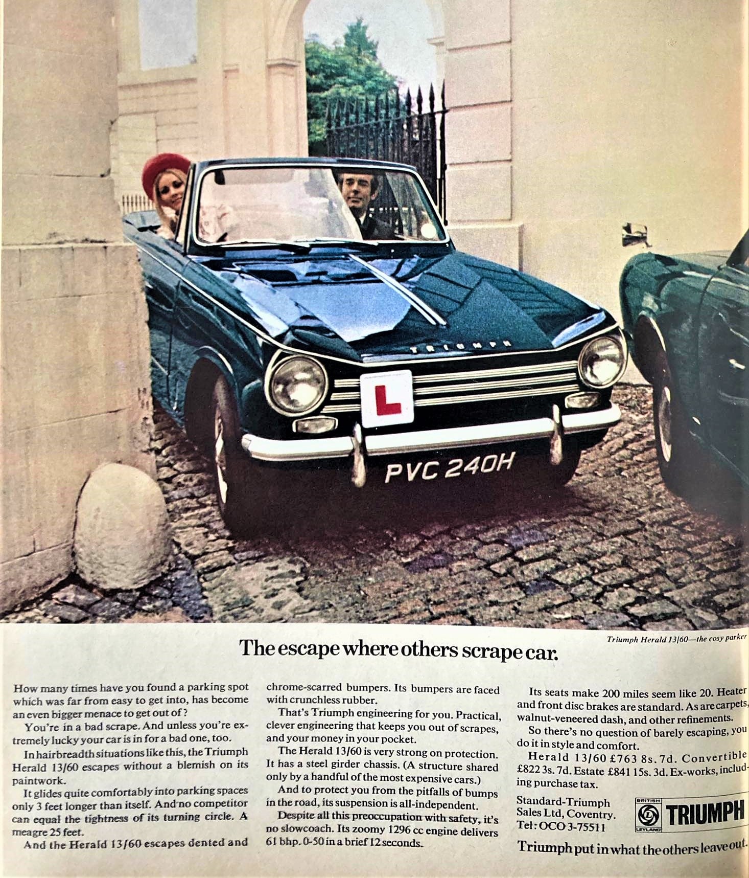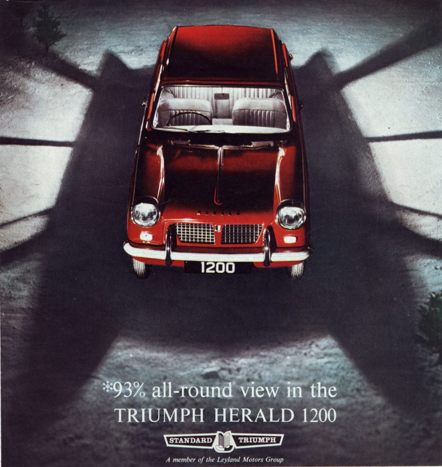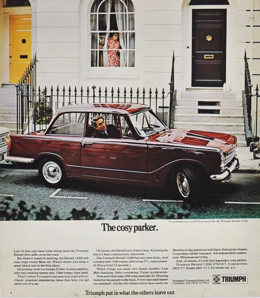 La progettazione della nuova vettura, che doveva sposare i canoni della Triumph, quali cura dei dettagli ed eleganza, ebbe come figura chiave il designer italiano Giovanni Michelotti (1921 – 1980), del quale ricorre quest’anno il centenario della nascita. Quest’ultimo delineò, in tempi record il design definitivo della nuova vettura, un’elegante tre volumi a due porte, sviluppata sotto la supervisione del direttore tecnico Harry Webster. Caratteristica peculiare della Herald era la superficie vetrata estremamente ampia, che garantiva il 93% di visibilità a 360°. Per il resto la nuova nata, era tutt’altro che rivoluzionaria, poiché basata su un’impostazione meccanica e costruttiva classica, tuttavia rimase tra i modelli più importanti per Triumph, segnando inoltre, l’inizio della collaborazione con Michelotti, che firmò altri modelli importanti, tra questi, l’iconica Spitfire del 1962.