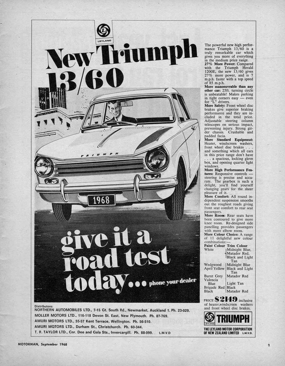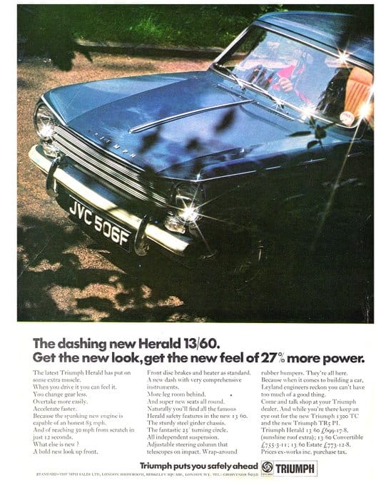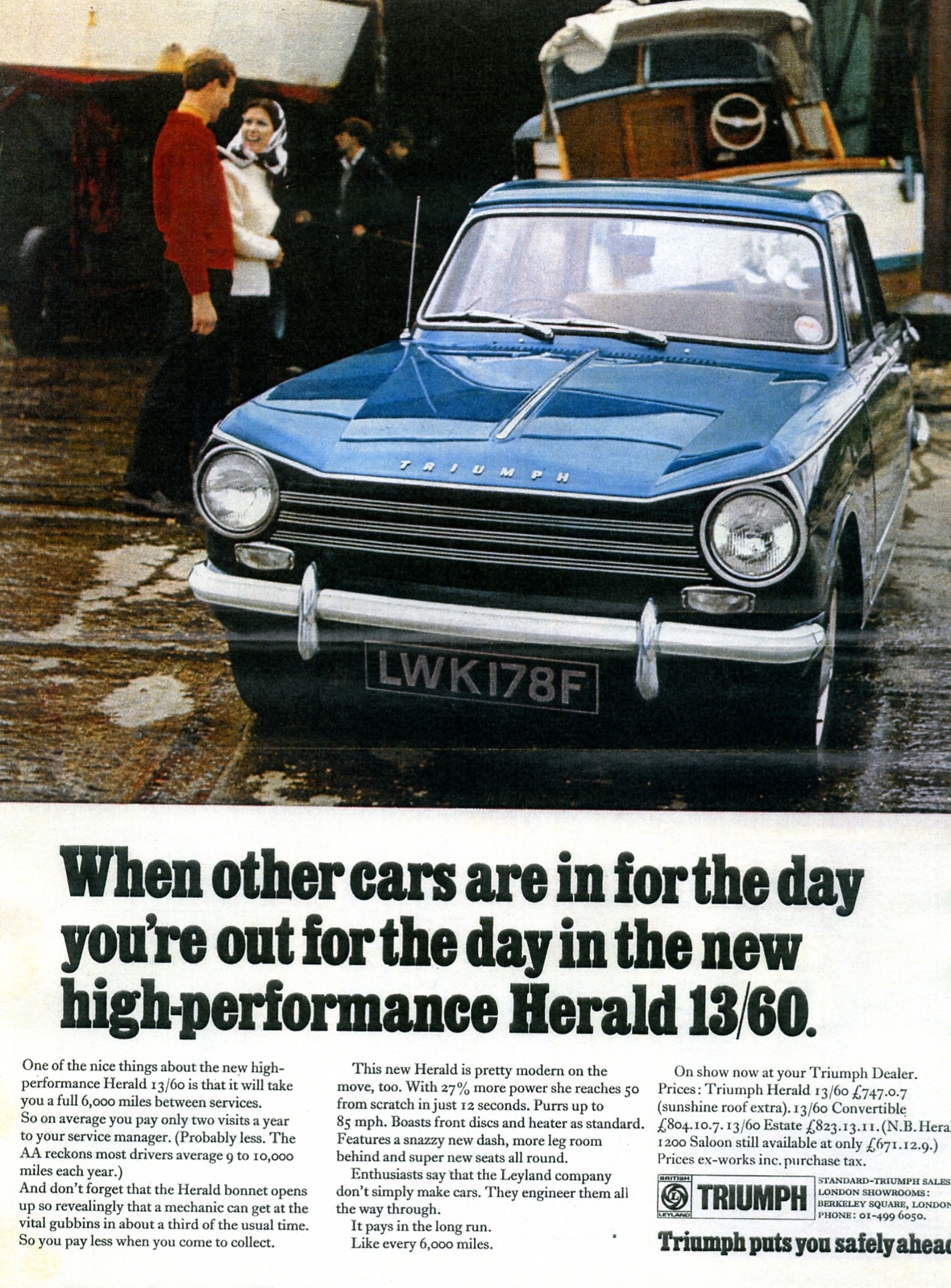 Nel 1963 debuttò la nuova Herald 12/50, con motore potenziato a 51 CV e freni a disco di serie. Quattro anni più tardi, nel 1967, il modello venne aggiornato nello stile, con un nuovo frontale, che si ispirava al modello Vitesse, con il quale la Herald, condivideva piattaforma e lamierati. Vennero rinnovati anche gli interni ed il cruscotto. In occasione dell’aggiornamento le 12/50, vengono sostituite dalle nuove 13/60 con motore da 1296 CC e 61 CV, che, grazie all’adozione del carburatore, garantivano prestazioni migliori rispetto al precedente modello. Dopo quest’ultimo aggiornamento la produzione della modello, proseguì fino al 1971 quando, dopo aver totalizzato oltre mezzo milione di unità vendute, lasciò il testimone alla più moderna 1300.
