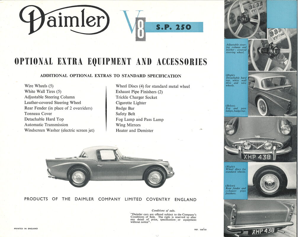 Nonostante la linea di rottura, la SP250, era una Daimler a tutti gli effetti, e questo lo si evinceva dalla raffinata cura degli interni, realizzati con pellami pregiati. Malgrado le ottime prestazioni e la cura costruttiva, il modello non riscosse il successo sperato, totalizzando meno di 3.000 esemplari nei 5 anni di produzione. Il flop della vettura sancì la fine dell’indipendenza per la Daimler, che sempre più in crisi, venne rilevata dalla Jaguar, già a partire dal 1960. Il cammino della casa, continuò senza grandi novità, fino al 2009, quando l’indiana Tata, nuova proprietaria dei marchi Jaguar e Land Rover, decise che ormai non c’era più spazio per il marchio Daimler, già da anni relegato ad un ruolo marginale, inadatto alla suo blasone e alla sua storia.