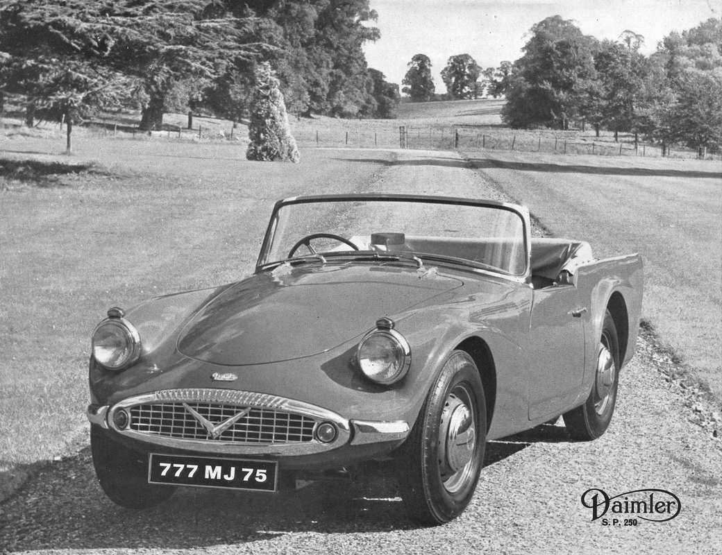 Il debutto della nuova Daimler, denominata SP250, avvenne nel 1959, e sin da subito colpì per la sua linea fin troppo originale, caratterizzata da un frontale basso con una generosa presa d’aria, che richiamava vagamente la silhouette di un pesce, il posteriore era invece caratterizzato da due marcate pinne e anche la vista laterale era molto movimentata, con due vistose nervature posizionate in corrispondenza dei passaruota. Se lo stile quindi, era deciso e originale, di netta rottura con il passato, sotto il profilo tecnico la vettura era realizzata su un telaio separato a cui veniva ancorata la carrozzeria realizzata in fibra di vetro, ciò permetteva quindi un peso ridotto. Il propulsore posizionato longitudinalmente all’anteriore era un V8 da 2458 CC, con testata in alluminio e basamento di ghisa, da 137 CV, grazie anche all’adozione di 2 carburatori SU. La trazione era sulle ruote posteriori, mentre la trasmissione era manuale a 4 marce. Notevole la velocità massima di quasi 200 Km/h.